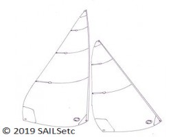 Made from 75 micron film, seams are not sewn, shaping is standard F2, corner patches are white standard patches, clear Mylar tape on the mainsail luff.